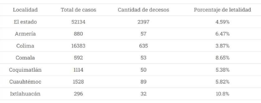 Puede verse que las menores letalidades han sido en Villa de Álvarez y en Colima capital. Las más altas en Ixtlahuacan, Co -