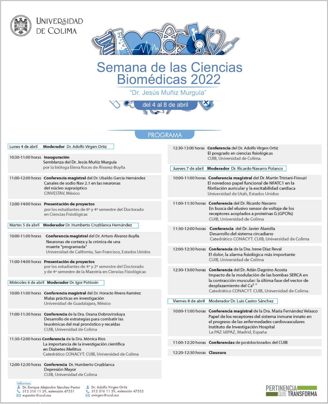 Durante el resto de la semana estarán impartiendo conferencias especializadas científicos de reconocido prestigio a nivel mundial de diferentes instituciones como el CINVESTAV, la Universidad de California, San Francisco, la Universidad de UTAH, la Universidad de Guadalajara y del Instituto de Investigación Hospital La Paz IdiPAZ, de Madrid, España, además de conferencias impartidas por profesores de Biomédicas y ponencias por parte de estudiantes del posgrado en Ciencias Fisiológicas.