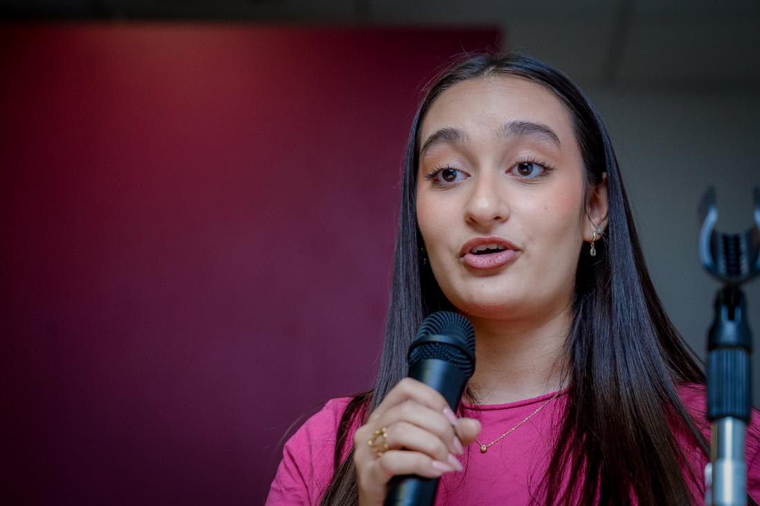Como parte del acto inaugural, Ana María Calderón Aguirre, alumna de la Facultad de Arquitectura, les dijo a los y las aspirantes que elegir una carrera es una de las decisiones más importantes en la vida de un estudiante: “No es solamente decidir qué se va a estudiar durante algunos años, es comenzar a construir un proyecto de vida, una manera de contribuir a la sociedad. Es empezar a imaginar quién quiero ser, qué quiero aportar y desde dónde quiero hacerlo”.