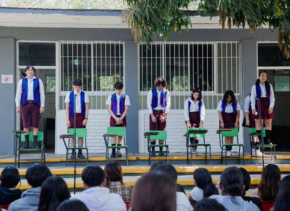 Entre risas, suspiros y miradas angustiadas por el desarrollo de la obra, las y los estudiantes del Bachillerato 32 mantuvieron la atención en el diálogo y las actuaciones. En los momentos críticos de la obra, fue posible notar los cambios de humor entre el público.