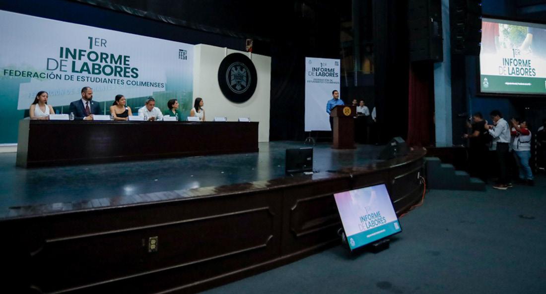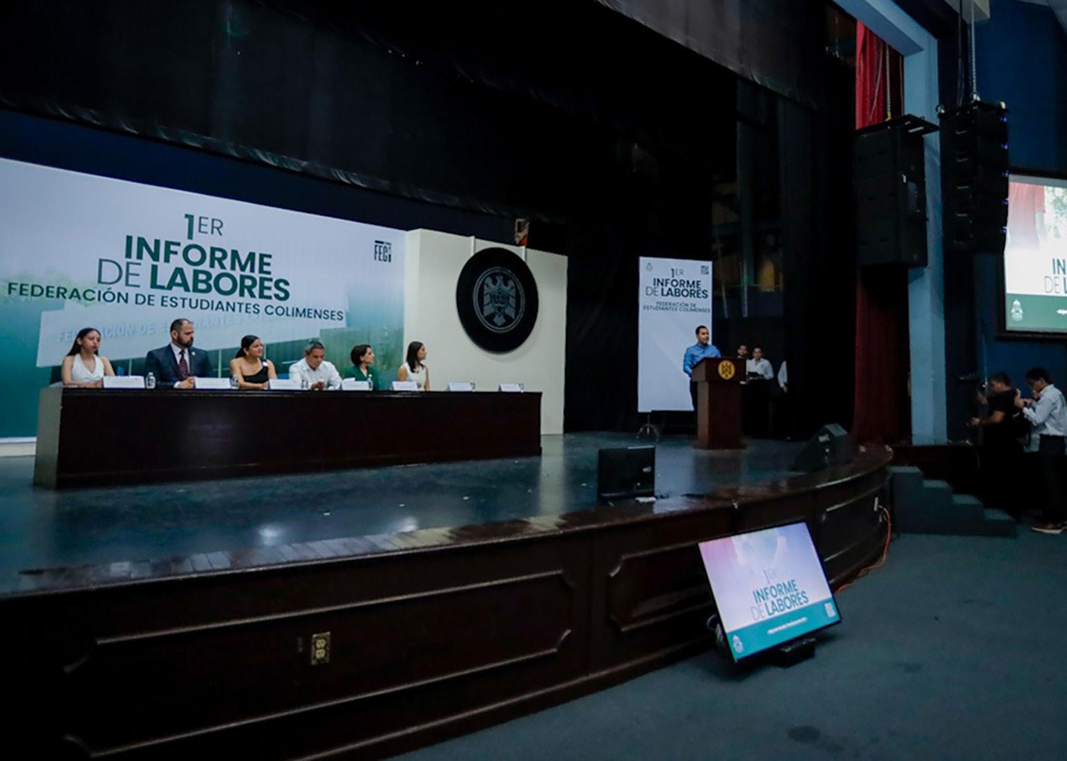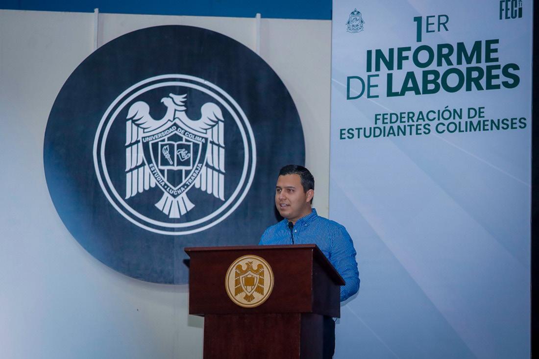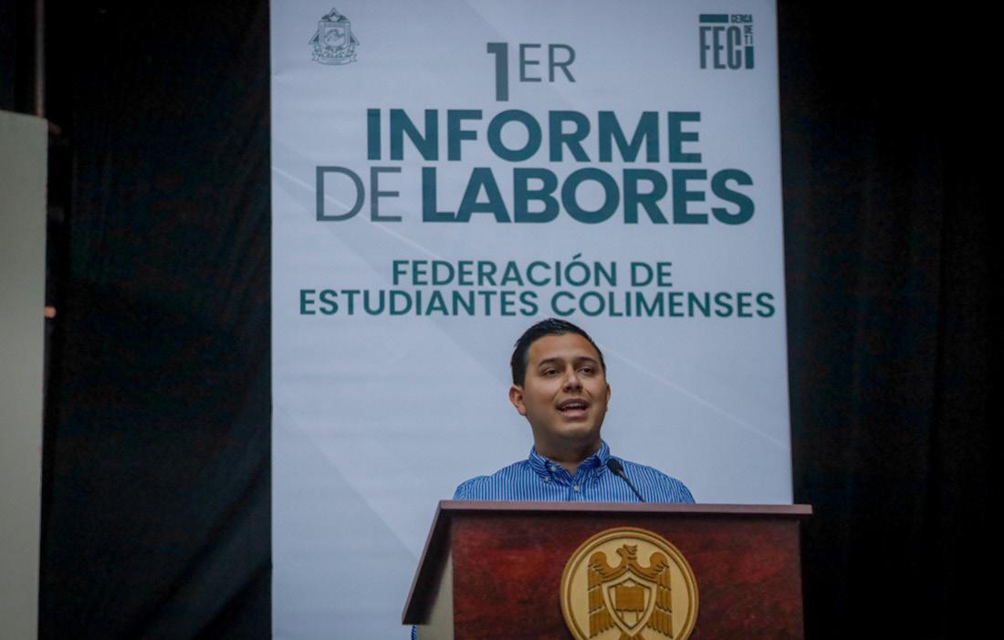 Al rendir su primer informe de labores como presidente de la Federación de Estudiantes Colimenses (FEC), Alejandro Novela Castañeda destacó los resultados alcanzados, los retos enfrentados y las acciones emprendidas por esta Federación, que impactaron de manera directa a más de 16 mil estudiantes. Rindió su informe en el Paraninfo Universitario, en un evento al que asistieron Christian Jorge Torres Ortiz Zermeño, Rector de la Universidad de Colima (UdeC), así como funcionarios estatales, federales, exrectores y cientos de estudiantes.