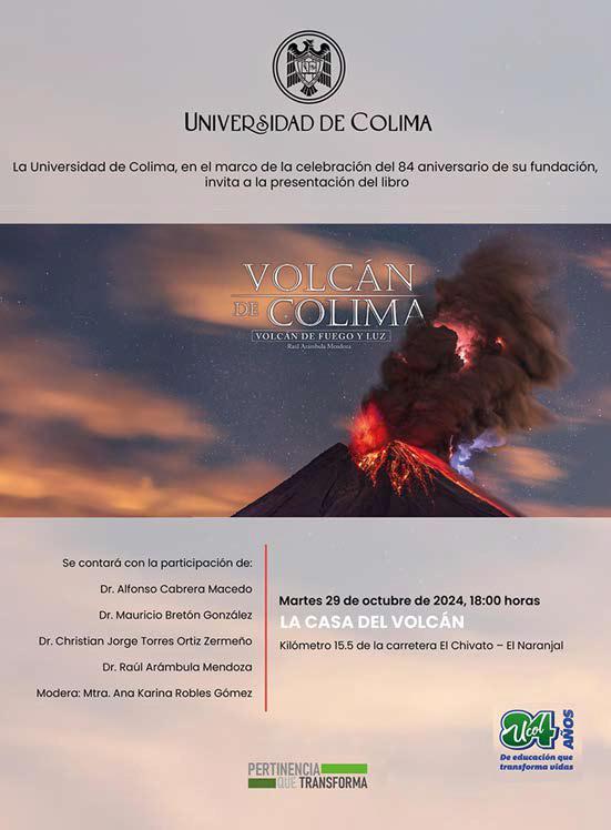 Sobre el 84 aniversario de la Universidad, dijo que este 29 de octubre se tiene la presentación del libro Volcán de Colima. Volcán de fuego y luz, del investigador Raúl Arámbula Mendoza, a las 6 de la tarde, en la Casa del Volcán. “Raúl es un extraordinario investigador y fotógrafo; ha hecho un libro maravilloso, una joya, marcará una situación especial en la Universidad”.