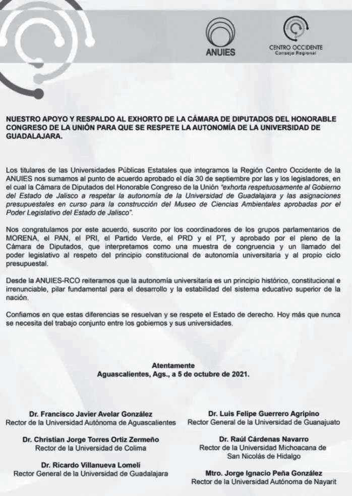 La petición realizada desde el Congreso de la Unión “exhorta respetuosamente al Gobierno del Estado de Jalisco a respetar la autonomía de la Universidad de Guadalajara y las asignaciones presupuestales en curso para la construcción del Museo de Ciencias Ambientales aprobadas por el Poder Legislativo del Estado de Jalisco”. En un documento signado por seis rectores, donde también firma el Rector de la Universidad de Colima, Christian Jorge Torres Ortiz Zermeño, los titulares de las universidades públicas de occidente se congratulan por el acuerdo de los grupos parlamentarios de Morena, PAN, PRI, Partido Verde, PRD y PT, al que interpretan como “una muestra de congruencia y un llamado al poder legislativo al respeto del principio constitucional de autonomía universitaria y al propio ciclo presupuestal”.
