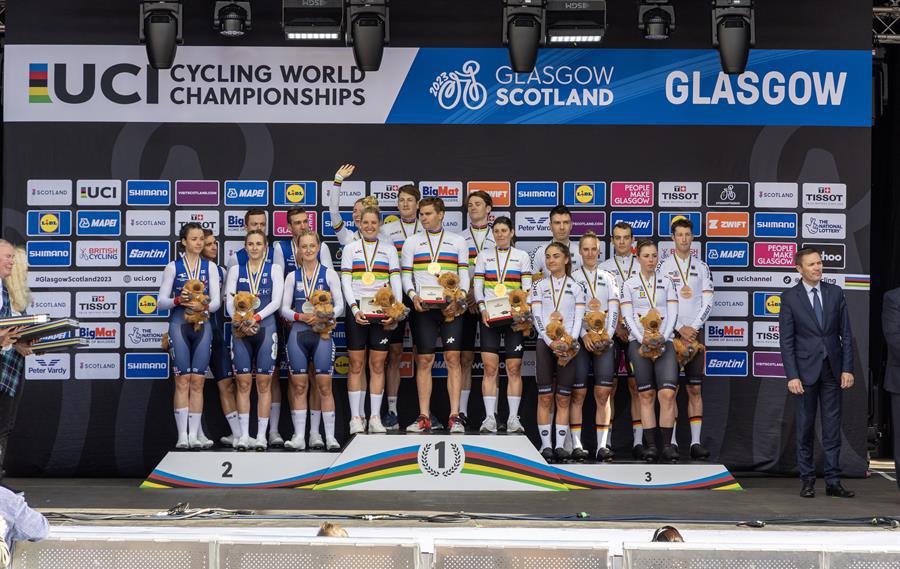 Suiza, con el mismo equipo que entonces, el compuesto por Stefan Kung, Stefan Bissegger, Mauro Schmid, Elise Chabbey, Nicole Koller y Marlen Reusser, revalidó en Glasgow, Reino Unido el oro en relevos mixtos por equipos logrado en 2022 en Wollongong, Australia.