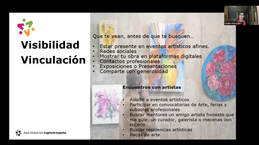 Por otra parte, dijo que el desarrollo artístico requiere organización, aprendizaje continuo y redes de apoyo, incluso en actividades creativas. “Me refiero a la red de apoyo, que incluye familia, amigos, compañeros artistas, asociaciones profesionales y mentores. Cuando vas a exponer y te encuentras a tus 10 amigos, te sientes acompañada, por eso son tan importantes las redes de apoyo”.