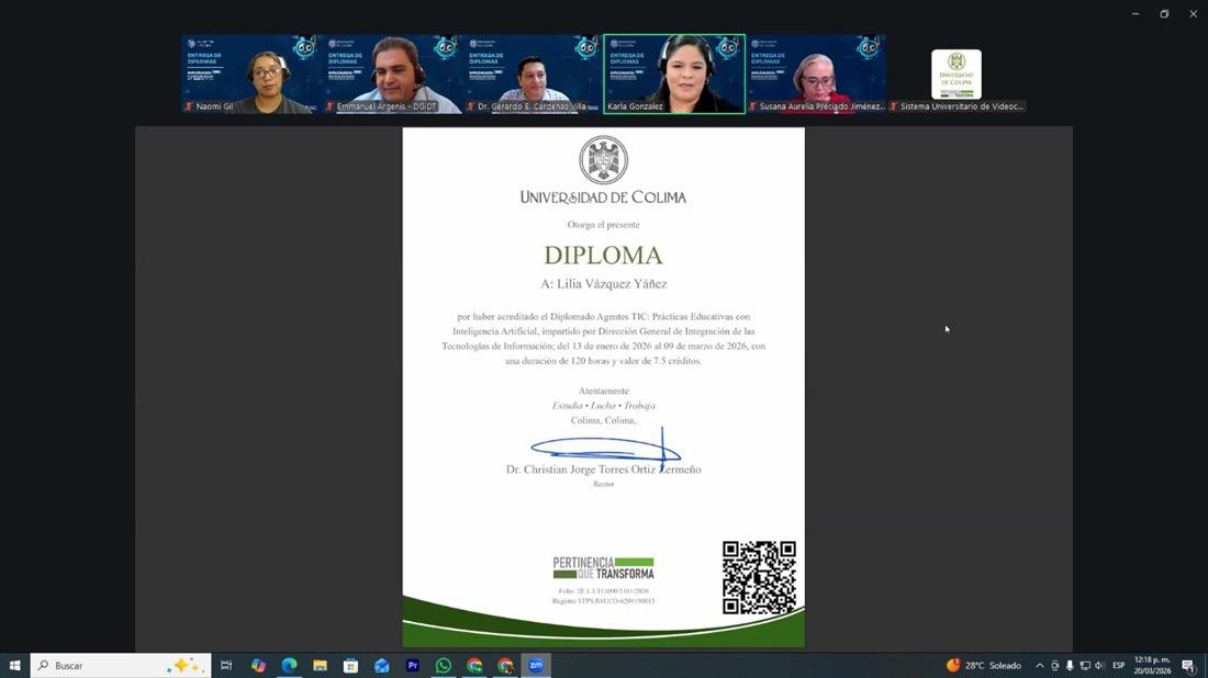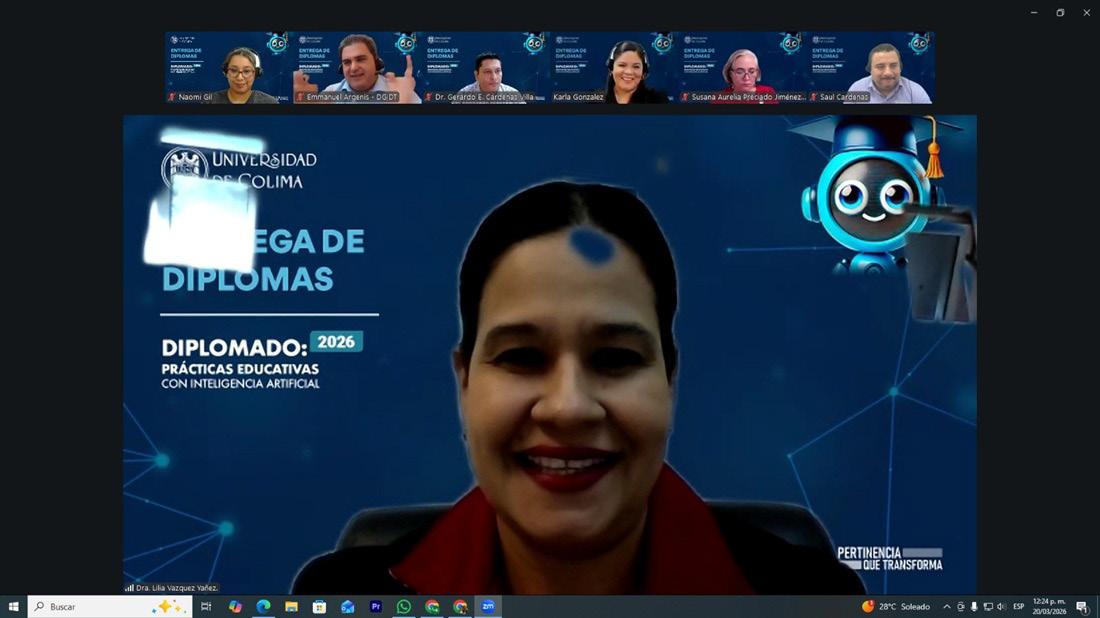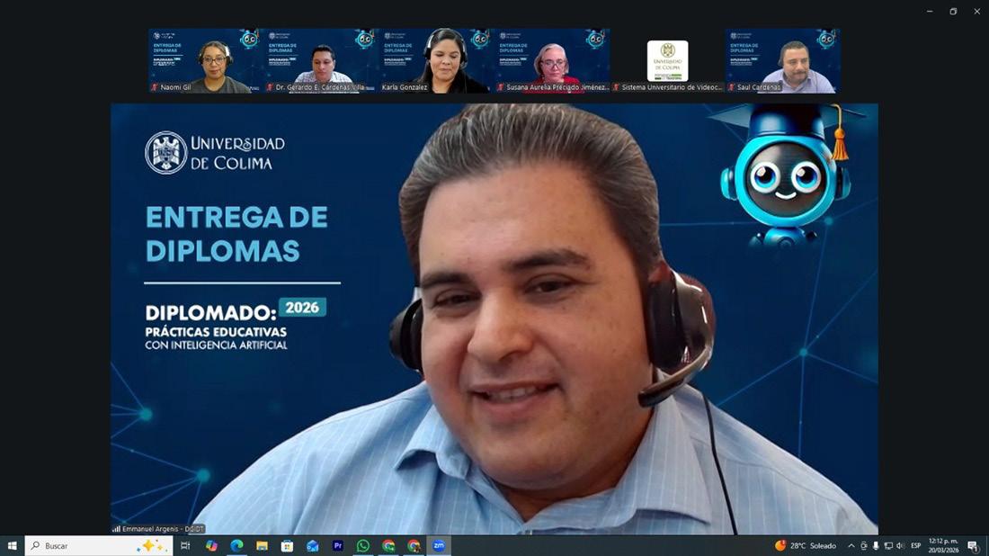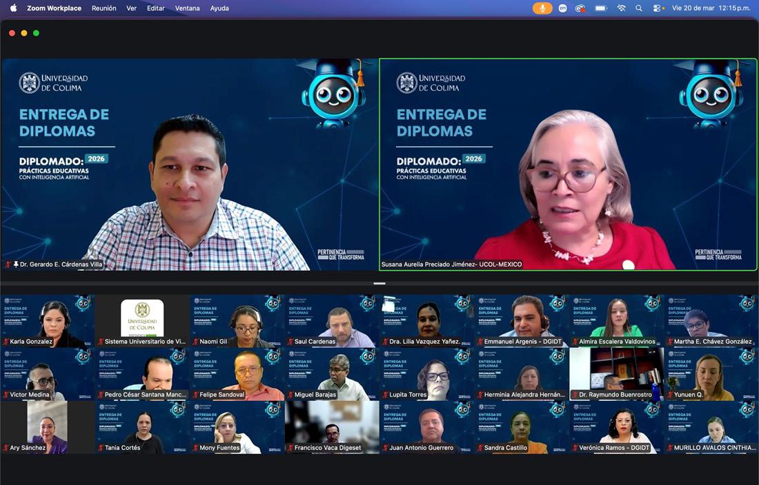 La Universidad de Colima (UdeC) llevó a cabo la ceremonia virtual de entrega de diplomas a las y los participantes del Diplomado “Agentes TIC: Prácticas Educativas con Inteligencia Artificial”, en su sexta edición.