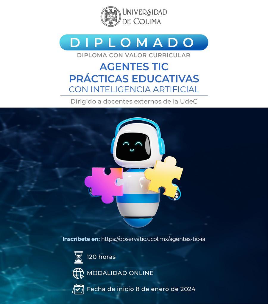 Desde el 23 de noviembre y hasta el próximo 13 de diciembre estarán abiertas las inscripciones al Diplomado Agentes TIC: Prácticas Educativas con Inteligencia Artificial, que organiza la Universidad de Colima a través de la Dirección General de Integración de las Tecnologías de Información ( D gi Dt ).