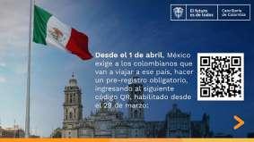 detallada sobre su itinerario durante su estadía en México”. La información agregó que tras diligenciar el formulario, los viajeros recibirán en su correo electrónico “un código QR que deberá ser presentado impreso al oficial de migración al momento de su llegada a México”. Para viajar a la nación norteamericana por turismo, negocios, estudios o tránsito, los colombianos no requieren visa siempre y cuando la estancia sea menor a 180 días, según las autoridades mexicanas. Igualmente, México retiró el requisito de la visa para los colombianos en 2012 en el marco de las negociaciones de la Alianza del Pacífico.