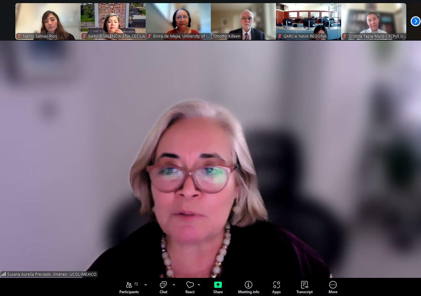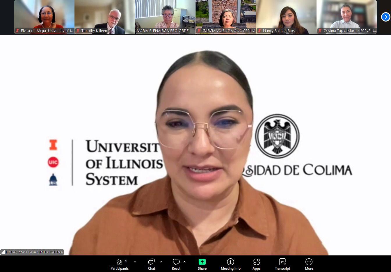 entre Illinois y México para enfrentar desafíos globales compartidos. Destacó que la iniciativa representa una oportunidad para generar conocimiento en beneficio de ambas comunidades universitarias, al tiempo que impulsa una cultura de apoyo mutuo y crea nuevas rutas de movilidad y formación para estudiantes mexicanos. “Queremos que nuestros campus en Chicago y Springfield sean un segundo hogar para ustedes”, afirmó, al referirse al interés por ampliar las oportunidades educativas y consolidar una red académica basada en la colaboración, el entendimiento cultural y el espíritu común de progreso. En representación del Rector Christian Jorge Torres Ortiz Zermeño, la doctora Susana Aurelia Preciado Jiménez, coordinadora general de Docencia de la Universidad de Colima, dijo que esta segunda edición de I-MMAS se inserta en una agenda global que exige cooperación, pensamiento crítico y soluciones compartidas ante problemáticas complejas que trascienden fronteras. Subrayó que el programa, desarrollado en colaboración con la Universidad de Illinois, permite a las y los estudiantes analizar desafíos reales desde enfo -
