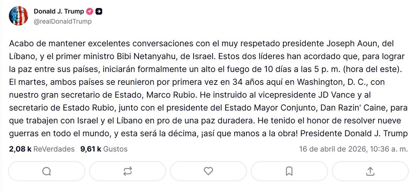 Este jueves (16), Trump anunció previamente un cese al fuego entre Líbano e Israel de 10 días, tras “excelentes” llamadas telefónicas con