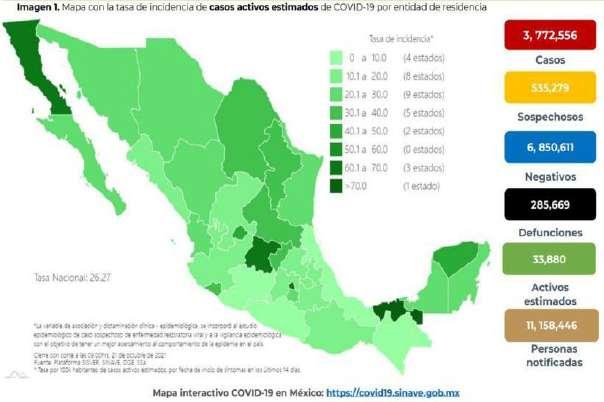 Según el reporte de la Secretaría de Salud del Gobierno de México, al corte de este jueves 21 de octubre, el país registra 285,669 muertes por coronavirus Covid-19, mientras que los casos positivos confirmados ascienden a 3 millones 772 mil 556 personas.