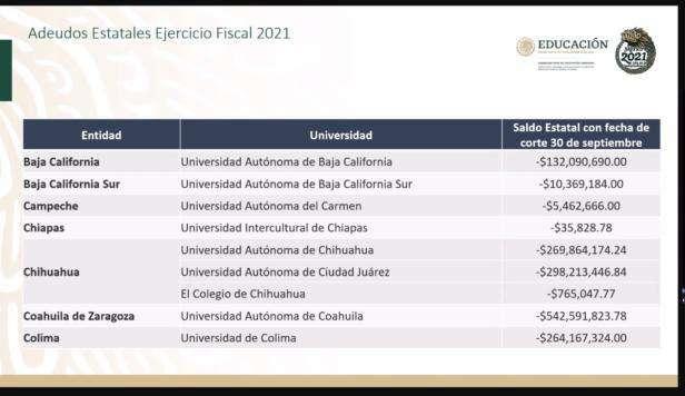 ta deuda a mil 950 millones, pero en 2021 se alcanzó la cifra de 3,700 millones de pesos; “tenemos atrasos en Baja California, Campeche, Chiapas, Chihuahua e incluso Colima, donde el gobernador se declaró en quiebra y desde marzo no le entregan ni un centavo a la universidad estatal, siendo que no era una universidad en crisis”.