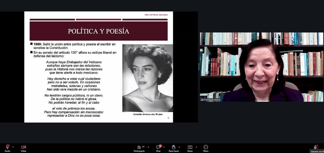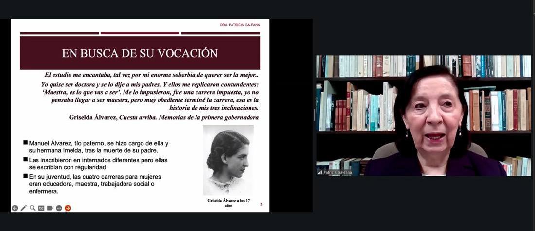 Para conmemorar 17 años del fallecimiento de la gobernadora, poeta y escritora, Griselda Álvarez Ponce de León (5 de abril de 1913, Guadalajara, Jalisco – 26 de marzo de 2009, Ciudad de México), se llevó a cabo, de manera virtual, la conferencia “Camino y legado de la primera gobernadora de México”, impartida por la historiadora y amiga personal de doña Griselda, Patricia Galeana Herrera, como parte del encuentro “Impacto de Griselda Álvarez en la Política de Hoy”.