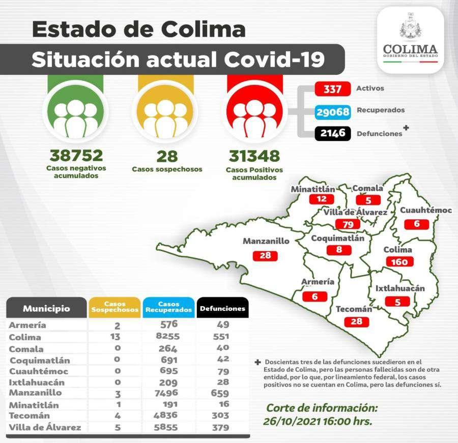 Con resultados al 23 de octubre, explicó la Secretaría de Salud, “Colima mostró un descenso en la tasa de reproducción efectiva que estima el ritmo de transmisión al pasar de 0.88 a 0.85 por cada caso registrado, la ocupación de camas generales pasó del 20 al 19% y la positividad pasó de 22 a 12%. En casos estimados activos por cada