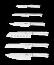 6 cuchillos exclusivos: Un cuchillo para pelar, un cuchillo multiusos, un cuchillo para trinchar, un cuchillo santoku, un cuchillo para pan y un cuchillo de chef.