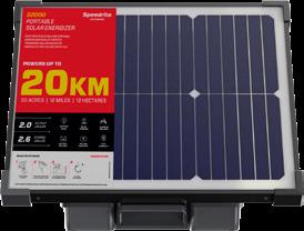 (2.0J output, 20 km) – includes internal 12V 14Ah battery and 28W integrated solar panel. Portable for temporary, semi-permanent and permanent installations. Powers fence all year round without intervention. 3 year warranty.