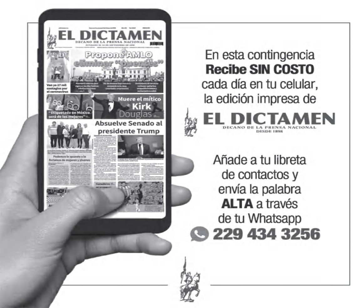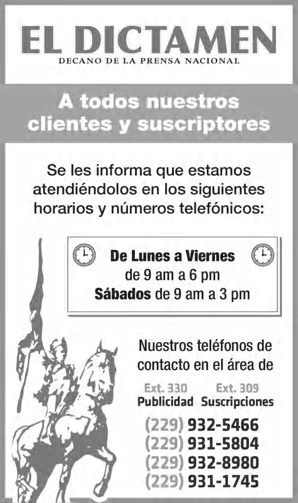 DE CA NO DE LA PRENSA NACION AL (229) 932-5466 (229) 931-5804 Ext. 330 Publicidad Ext. 309 Suscripciones (229) 932-8980 (229) 931-1745 Suscríbete completamente GRATIS a El Dictamen a través de WHATSAPP. No te pierdas las noticias del momento. Solo manda ALTA al 229 434 3256 VISITA NUESTRA PÁGINA