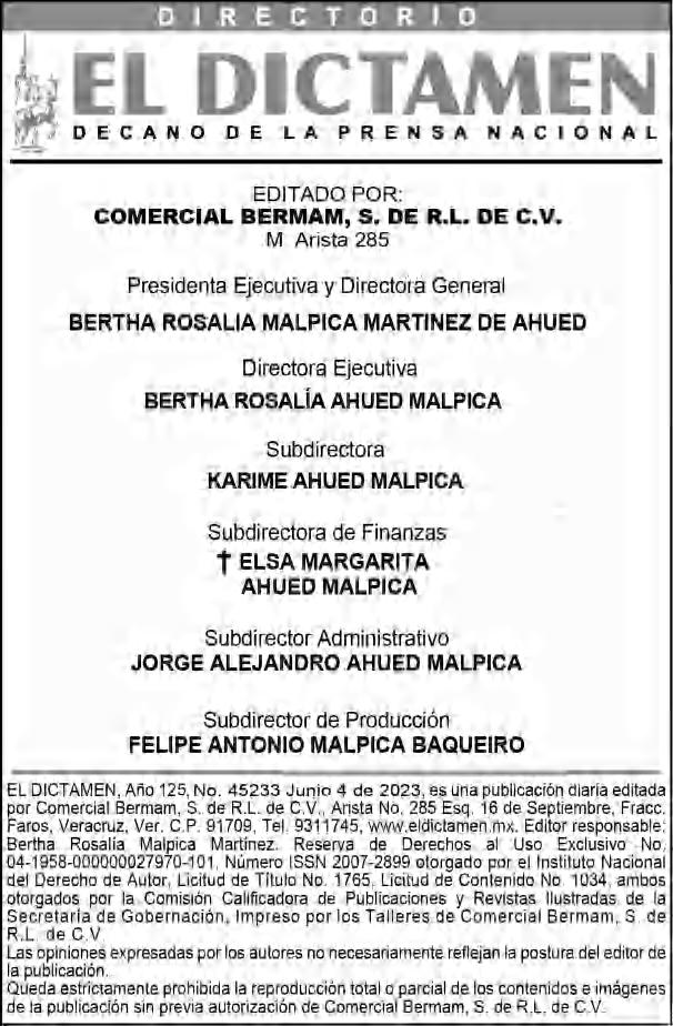 PRENSA NACIONAL BERTHA ROSALIA MALPICA MARTÍNEZ DE AHUED - PRESIDENTA EJECUTIVA Y DIRECTORA GENERAL JUAN MALPICA MIMENDI 1960-1998 JUAN MALPICA SILVA 1912-1960 PRECIO $10 www.eldictamen.mx Veracruz, Ver. a Domingo 4 de Junio de 2023