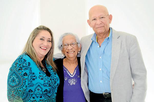 Visiblemente emocionada por las bendiciones que la envolvieron en el desayuno con que celebró su cumpleaños 94, en el hotel Playa Caracol, la profesora Luz del Carmen Valenzuela de Rojas con su hijo el Dr. Mario Rojas Valenzuela y su nuera Dra. Ana María Olano.