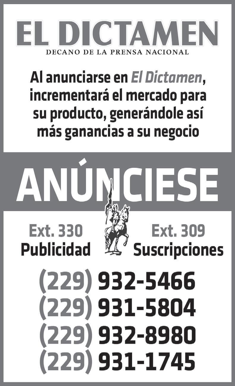 ROSALIA MALPICA MARTÍNEZ DE AHUED - PRESIDENTA EJECUTIVA Y DIRECTORA GENERALJUAN MALPICA MIMENDI 1960-1998JUAN MALPICA SILVA 1912-1960 PRECIO $10www.eldictamen.mx Veracruz, Ver. a Jueves 10 de Noviembre de 2022 VISITA NUESTRA PÁGINA México goleó a Irak Jorge Nuño, nuevo secretario de Comunicaciones, anuncia AMLO Ya hay denuncia por consumo de clonazepam: Zenyazen DE CA NO DE LA PRENSA NACION AL (229) 932-5466 (229) 931-5804 Ext. 330 Publicidad Ext. 309 Suscripciones (229) 932-8980 (229) 931-1745 Familiares, amigos, vecinos y sus compañeros de la Secretaría