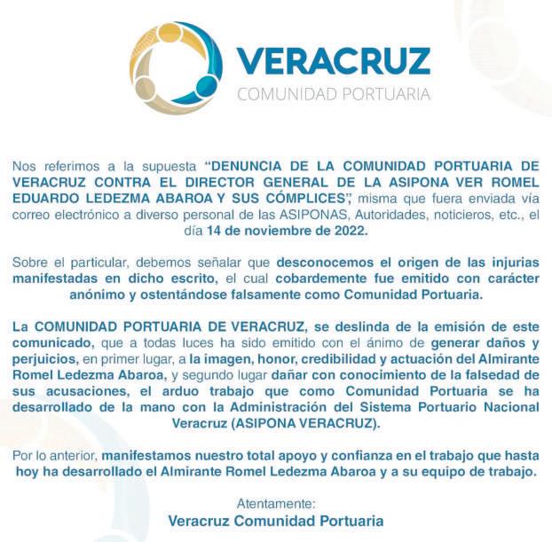 La Comunidad portuaria de #Veracruz muestra su respaldo al director general de ASIPONA el almirante Romel Ledezma Abaroa y se deslinda de un comunicado, que desde el anonimato fue enviado para dañar la imagen de la ASIPONA.