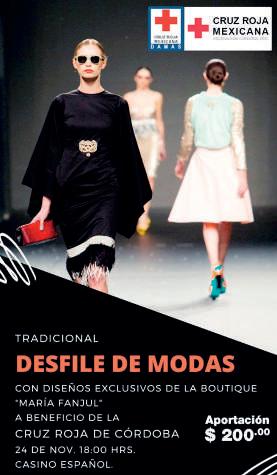 Como parte de la Colecta Na cional que la Cruz Roja Mexicana, Delegación Córdoba, realiza du rante este mes, la Coordinación de Damas Voluntarias llevará a cabo su tradicional “Desfile de Modas” para poder obtener recursos que ayuden en el funcionamiento de la institución. Con diseños exclusivos de la Boutique “María Fanjul”, este 24 de noviembre en punto de las 6 de la tarde, en las instalaciones del Casino Español, se llevará a cabo este importante evento, que exhibirá los creaciones de esta reconocida Boutique, teniendo como cuota de aportación, la cantidad de $200.00 (Dos cientos pesos).