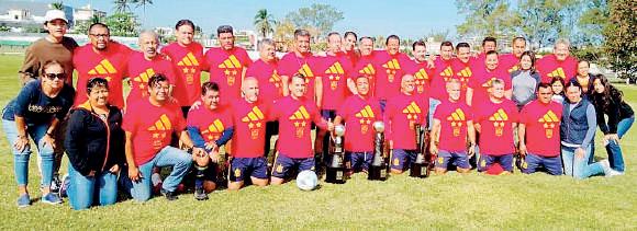 Tras coronarse campeonísimo de la categoría Premier de la Liga de Veteranos Oropeza, el equipo España continúa con los festejos y este domingo presumió sus trofeos en su casa, la facultad de Educación Física de la Universidad Veracruzana. Apenas el miércoles el equipo español fue objeto de reconocimiento en la ceremonia de premiación y la puesta en marcha del campeonato 2023 de la Liga Roberto Oropeza. España recibió los trofeos de Liga, de Copa y de Campeonísimo, y este domingo en un duelo de preparación ante Lyon, nuevo huésped de la categoría, reunió a toda su plantilla para tomarse la foto y hacer entrega de la playera del recuerdo de esta temporada de ensueño.