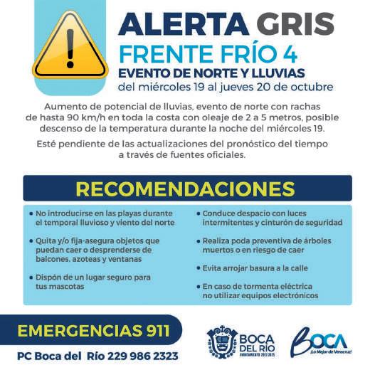 Debido a la llegada del Frente Frío 4 de la temporada invernal, el ayuntamiento de Boca del Río a través de su dirección municipal de Pro tección Civil replicó una vez más la Alerta Gris emitida por la Secretaría de Protección Civil del Estado.