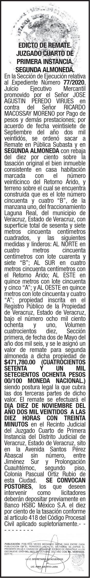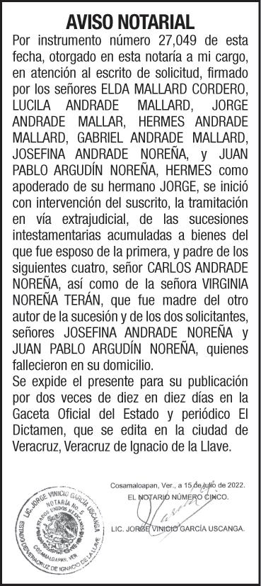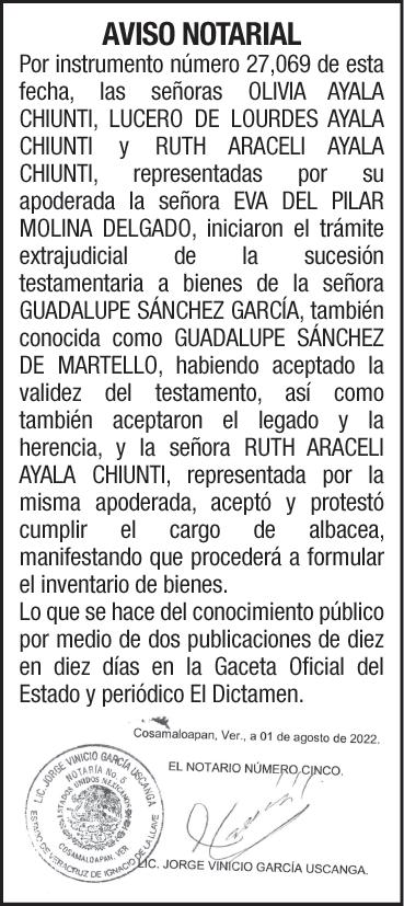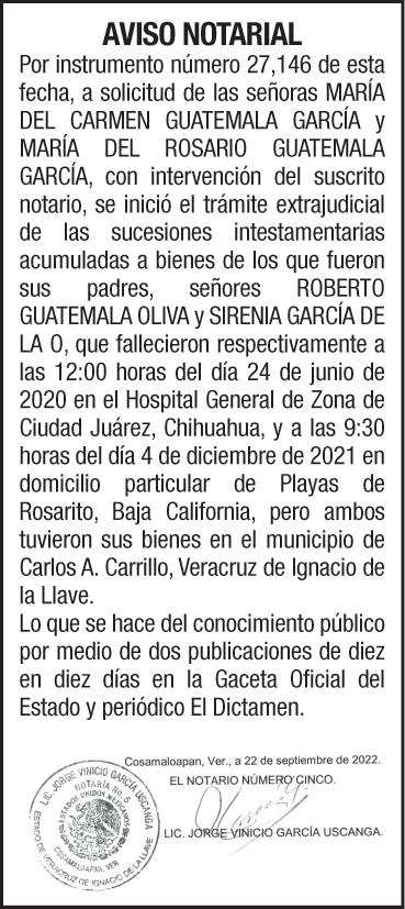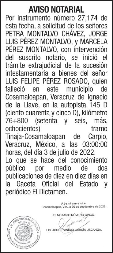 EXCELSIOR BUSCA: RECLUTADOR DE CAMPO EXPERIENCIA EN RECLUTAMIENTO MASIVO PERFILES OPERATIVOS VOLANTEO, FERIAS DE EMPLEO Y BOLSAS DE EMPLEO Salario: $1,300.00 SEMANALES Ofrecemos: PL+BONO METAS Informes: 5544482582, 5510687106 Lic.Yessenia Licona. LIC. VICTOR MANUEL YUNES DIAZ, TITULAR DE LA NOTARIA PUBLICA NÚMERO VEINTIUNO,DE LA DECIMOSÉPTIMA DEMARCACIÓN NOTARIAL DEL ESTADO DE VERACRUZ. AVISO NOTARIAL QUE MEDIANTE ACTA #40503 DE FECHA 23 DE SEPTIEMBRE DEL AÑO 2022; LAS SEÑORAS MARIA DEL SOCORRO Y CATALINA CAZARIN BENITO, SOLICITARON AL SUSCRITO NOTARIO, LA INTERVENCIÓN DE ESTA NOTARÍA, PARA REALIZAR EL PROCEDIMIENTO INTESTAMENTARIO EXTRAJUDICIAL DE, QUIEN EN VIDA LLEVARA EL NOMBRE DE ELBA BENITO CAPETILLO. PARA SU PUBLICACIÓN POR DOS VECES, DE DIEZ EN DIEZ DÍAS, EN EL DIARIO “EL DICTAMEN”, EXPIDO EL PRESENTE AVISO EN LA CIUDAD Y PUERTO DE VERACRUZ, ESTADO DE VERACRUZ DE IGNACIO DE LA LLAVE, A LOS 27 DÍAS DEL MES DE SEPTIEMBRE DEL AÑO 2022. LIC. VICTOR MANUEL YUNES DIAZ, TITULAR DE LA NOTARIA PUBLICA NÚMERO VEINTIUNO, DE LA DECIMOSÉPTIMA DEMARCACIÓN NOTARIAL DEL ESTADO DE VERACRUZ. AVISO NOTARIAL QUE MEDIANTE INSTRUMENTO PÚBLICO NÚMERO 40467 DE FECHA QUINCE DE SEPTIEMBRE DEL AÑO 2022 OTORGADO ANTE LA FE DEL SUSCRITO NOTARIO SE HIZO CONSTAR, LA ACEPTACIÓN DE HERENCIA Y ACEPTACIÓN DEL CARGO DE ALBACEA EN FAVOR DE GUADALUPE LIANO CONTRERAS EN LA SUCESIÓN INTESTAMENTARIA EXTRAJUDICIAL A BIENES DE ANGEL GONZALEZ LUCERO, MANIFESTANDO QUE PROCEDERA A FORMAR EL INVENTARIO Y AVALUO DE LEY. PARA SU PUBLICACIÓN POR DOS VECES, DE DIEZ EN DIEZ DÍAS, EN EL DIARIO “EL DICTAMEN”, EXPIDO EL PRESENTE AVISO EN LA CIUDAD DE VERACRUZ, ESTADO DE VERACRUZ DE IGNACIO DE LA LLAVE, A LOS VEINTISIETE DIAS DEL MES DE SEPTIEMBRE DEL 2022. JUZGADO DECIMOSEGUNDO DE PRIMERA INSTANCIA ESPECIALIZADO EN MATERIA FAMILIAR EDICTO Que en este H. Juzgado Décimo Segundo de Primera Instancia del Distrito judicial de Veracruz, Veracruz; se encuentra radicado el expediente número 1281/2022/ III del índice de este Juzgado, Diligencias de Jurisdicción voluntaria de Presunción de Muerte de Gloria Celia Pérez Romero promovidas por Leady Diana Pérez Pérez por propio derecho. • Publíquese por DOS MESES EN INTERVALOS DE QUINCE DÍAS, llamando a cualquier persona que tenga interés jurídico en el procedimiento de presunción de muerte correspondiente a la ciudadana Gloria Celia Pérez Romero, citando a la ciudadana Gloria Celia Pérez Romero, para que comparezca a las presentes diligencias en un plazo de TRES MESES, contados a partir del día siguiente al de la última publicación de edictos, a efecto de que manifieste lo a que su interés convenga. Transcurrido el término