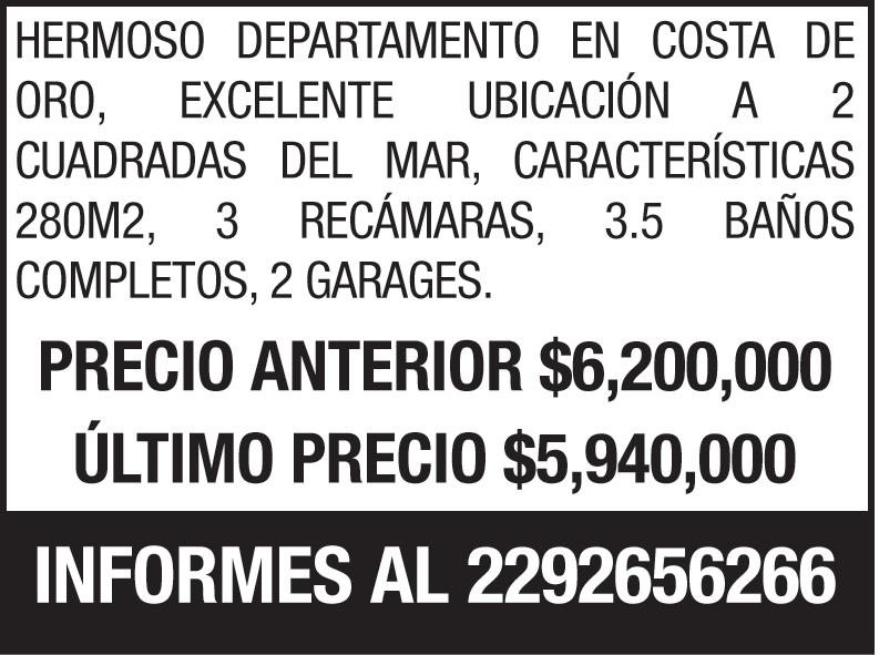 Hermosa Residencia en costa de oro, a una cuadra de la playa, 3 recámaras más 1 independiente todas con baño y vestidor, sala comedor, desayunador, sala de tele, cocina, garage para 4 autos, cuarto de servicio, área de lavado, jardín alberca, totalmente climatizada y amueblada recién remodelada toda, 45,000 inf al 2299844972.