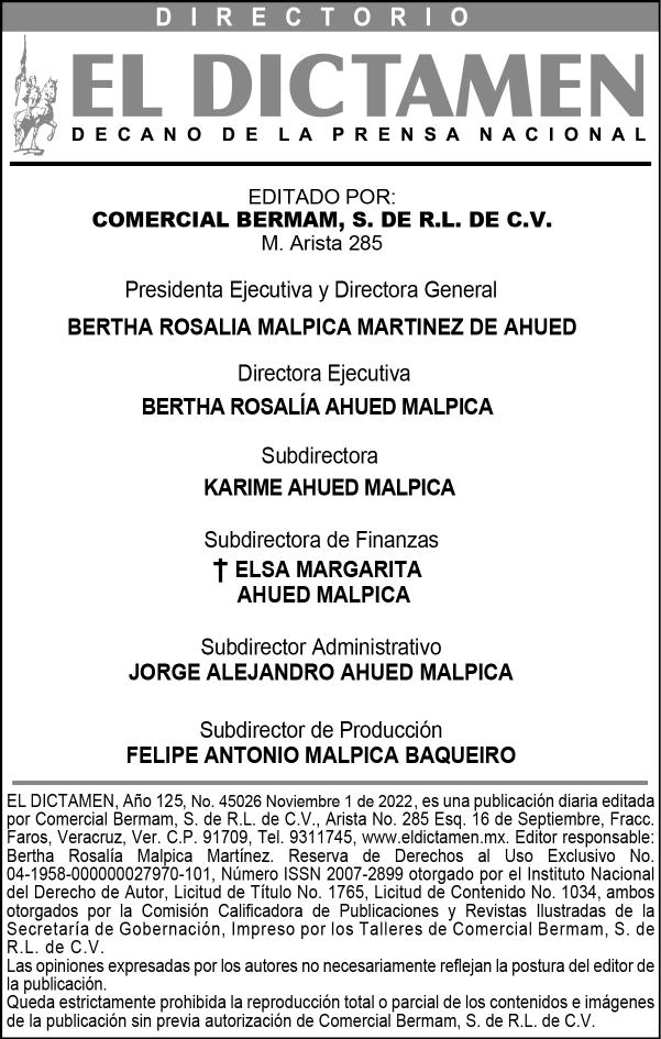 Año 125 No. 45026 FUNDADO EL 16 DE SEPTIEMBRE DE 1898 DECANO DE LA PRENSA NACIONAL BERTHA ROSALIA MALPICA MARTÍNEZ DE AHUED - PRESIDENTA EJECUTIVA Y DIRECTORA GENERALJUAN MALPICA MIMENDI 1960-1998JUAN MALPICA SILVA 1912-1960 PRECIO $10www.eldictamen.mx Veracruz, Ver. a Martes 1 de Noviembre de 2022 VISITA NUESTRA PÁGINA CCME realiza rueda de Negocios del Sureste Cambio de mando de armas en la Tercera Región Naval Montan periodistas altar de muertos en memoria de comunicadores fallecidos