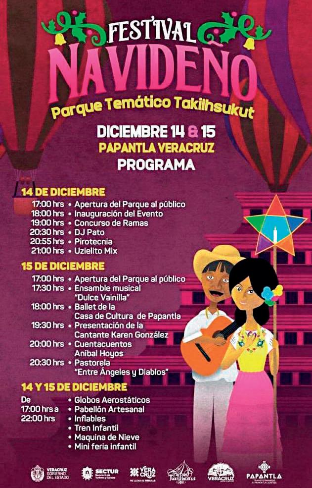 Con pistas de hielo, diversas actividades culturales y recreativas, la Secretaría Turismo y Cultura cerrará fuertemente el año, para de esta forma poder incrementar el número de visitantes, así como la derrama económica. Al respecto, el subsecretario de Promoción Turística, Héctor Aguilera Lira, invitó a los veracruzanos a acudir al Festival Navideño en el parque Takilhsukut, en el municipio de Papantla, donde habrá vuelo en globos aerostáticos de Teotihuacán.