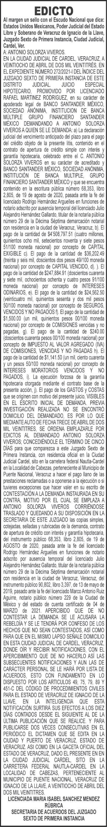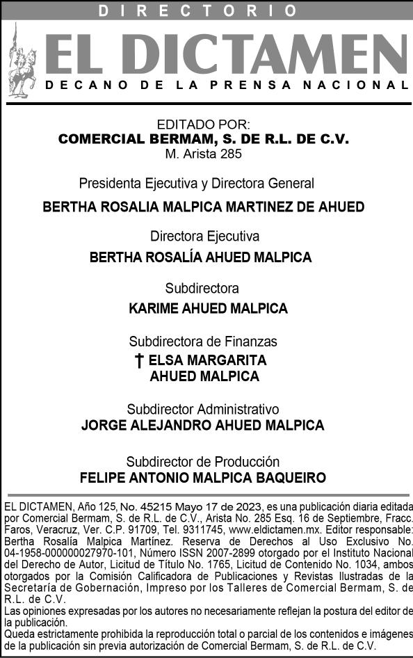 Año 125 No. 45215 FUNDADO EL 16 DE SEPTIEMBRE DE 1898 DECANO DE LA PRENSA NACIONAL BERTHA ROSALIA MALPICA MARTÍNEZ DE AHUED - PRESIDENTA EJECUTIVA Y DIRECTORA GENERAL JUAN MALPICA MIMENDI 1960-1998 JUAN MALPICA SILVA 1912-1960 PRECIO $10 www.eldictamen.mx Veracruz, Ver. a Miércoles 17 de Mayo de 2023 VISITA NUESTRA PÁGINA