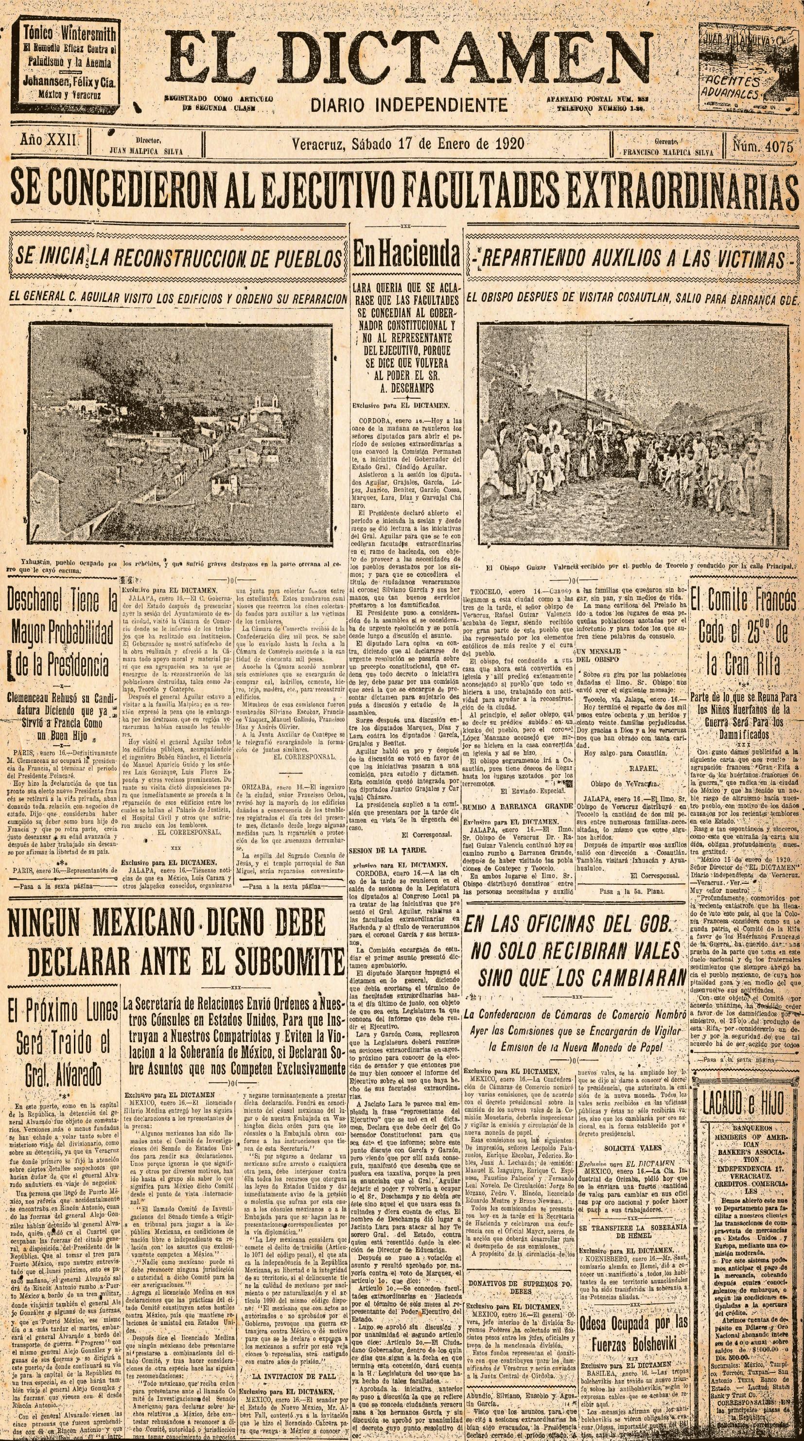 JUAN MALPICA SILVA 1912-1960 PRECIO $10 www.eldictamen.mx Veracruz, Ver. a Miércoles 25 de Enero de 2023 VISITA NUESTRA PÁGINA Suscríbete completamente GRATIS a El Dictamen a través de WHATSAPP. No te pierdas las noticias del momento. Solo manda ALTA al 229 434 3256 NO DE LA PRENSA CION DESDE 1898 (229) 932-5466 (229) 931-5804 Ext. 330 Publicidad Ext. 309 Suscripciones (229) 932-8980 (229) 931-1745 Se desata corrupción destituciones y renuncias en Ucrania Inician las colposcopias en Cosoleacaque Pide AMLO a Celac libertad de Pedro Castillo Al realizar la práctica de la roza Denunciarán a reincidentes en provocar incendios forestales En la colonia 9 de Abril de Xalapa Entrega Ayuntamiento obra de pavimentación