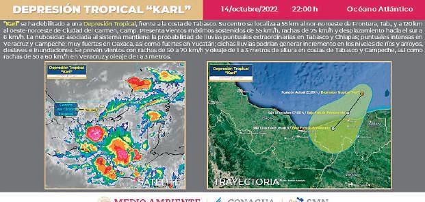 A las 22:00 horas de anoche, tiempo del centro de México, el centro Karl, ahora como depresión tropical, se ubicó a 55 kilómetros (km) al nor-noroeste de Frontera, Tabasco, y a 120 km al oeste-noroeste de Ciudad del Carmen, Campeche, con vientos máximos sostenidos de 55 kilómetros por hora (km/h), rachas de 75 km/h y desplazamiento hacia el sur a 6 km/h. El empresario Fidel Kuri Grajales dejó el Centro de Reinserción de Santiaguito, a las 23:28 de la noche, después de que cumplió con los requisitos para seguir su proceso en libertad. De acuerdo a ESPN el ex directivo del equipo de Veracruz esperaba salir de prisión desde el miércoles, una vez que había cumplido con presentar la garantía de 20 millones de pesos, un domicilio en el Estado de México y solicitar que se le pusiera un brazalete rastreador, para que se supiera su ubicación todo el tiempo, medidas cautelares que se le solicitaron para seguir su proceso fuera de prisión. Una vez que las autoridades visitaron el domicilio y se cercioran de la veracidad de los datos que presentó Fidel Kuri, se le permitió salir del penal de Santiaguito a las 23:28 horas de ayer. En la gráfica aparece acompañado de Jorge Kayser Vives. AGENCIAS EL DICTAMEN PRINCIPAL 2 AGENCIAS EL DICTAMEN