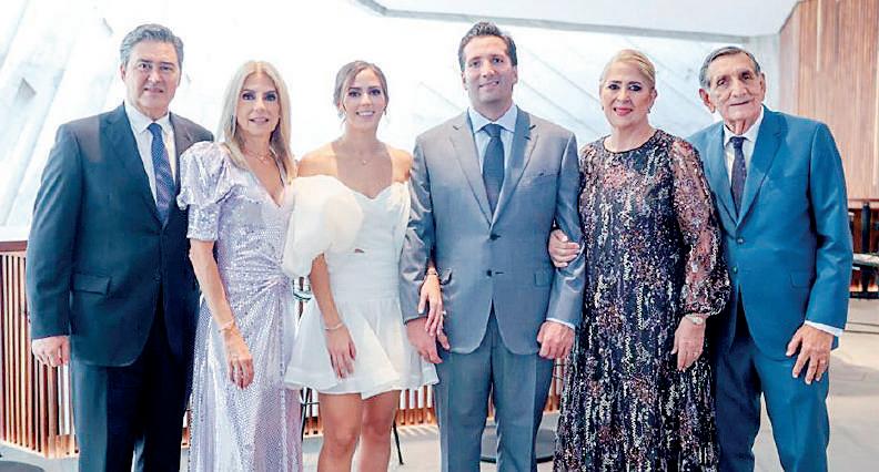 Miranda Álvarez Morfín y Alberto Pérez Acasuso con José Manuel y Nena Morfín de Álvarez, padres de la novia, al igual que Alberto y Pilar Acasuso de Pérez Kuri, papás del novio.