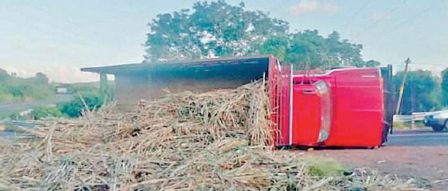 Vuelca camión cargado con caña de azúcar en Tolome, el chófer y dos acompañantes venían ebrios.