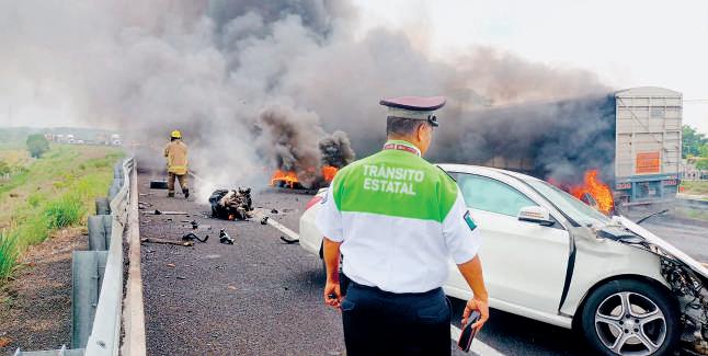 que transportaba costales de cebada, lo que ocasionó que con la fricción de los metales se desatara un incendio que consumió la cabina del tractocamión y severos daños, con desprendimiento de motor del auto de lujo. Pese a lo aparatoso del incidente, no se reportaron personas fallecidas mucho menos lesionados graves, ambos choferes afortunadamente presentaron únicamente golpes contusos, sin ameritar traslado al hospital. Personal paramédico y de la brigada contra incendios de Protección Civil y Bomberos de La Antigua, atendieron la emergencia, valoraron a los operadores y sofocaron las llamas que terminaron por consumir la cabina del tractocamión.