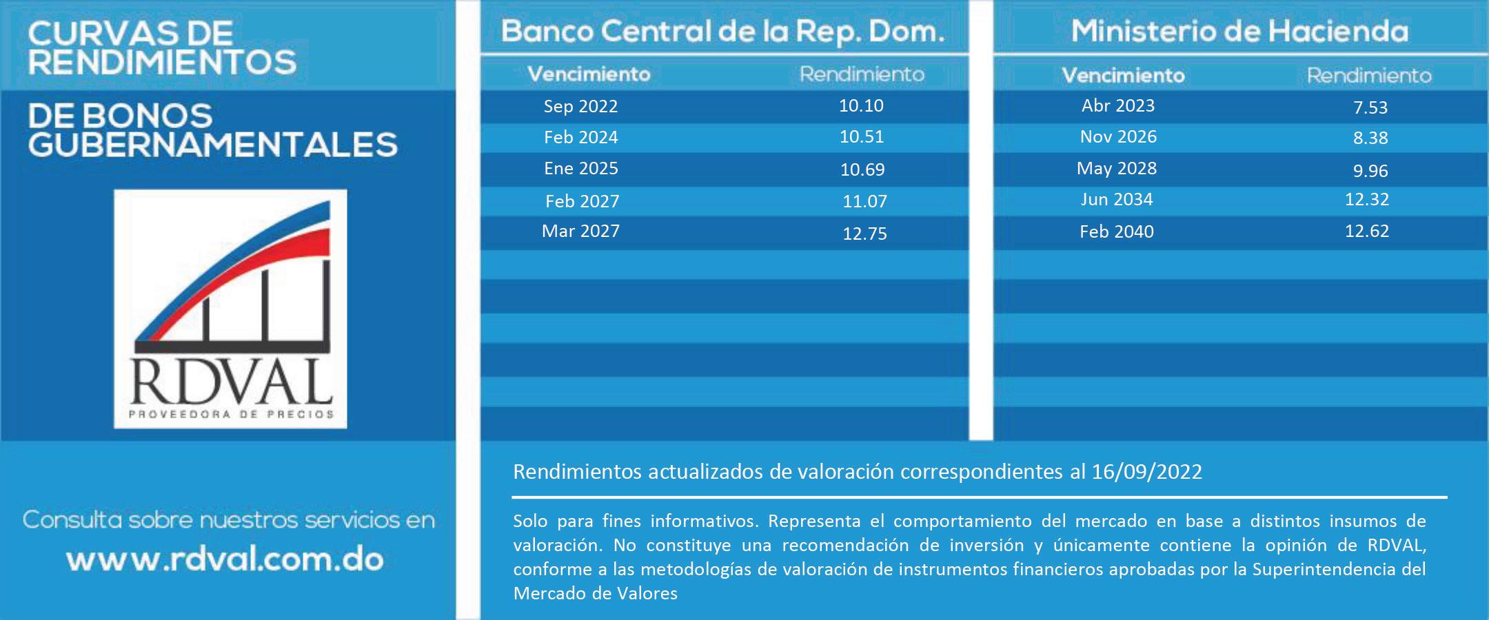 20 Santo Domingo, República Dominicana. Año 8. Nº 360. jueves 22 de septiembre de 2022 INDICADORES Activa Pasiva Tasas de Interés (Promedio última semana) - Bancos Múltiples Preferencial Preferencial 10.26% 10.66% Consumo Depósitos de Ahorros 19.89% 0.22% Promedio Ponderado Promedio Ponderado 13.01% 8.74% Hipotecario 11.78% Comercio Público en General 11.78% 7.13% Promedio Simple 13.86% Promedio Simple 8.26% Precio del oro, plata y niquel En US$ por onza En US$ por libra 21 de septiembre Oro Niquel Plata 14 de septiembre 1,705.86 10,775 19.44 1,672.72 11,276 19.67 Fuente: Banco Central Niquel En RD$ por galón. Gasolina Prémium Gasolina Regular Gasoil Óptimo Gasoil Regular Kerosene GLP Gas Natural 293.60 274.50 241.10 221.60 338.10 147.60 28.97 293.60 274.50 241.10 221.60 338.10 147.60 28.97 Fuente: Miniterio de Industria y Comercio y Mipymes Del 10 al 16 septiembre del 2022Del 17 al 23 septiembre del 2022 Precios de los combustibles en República Dominicana TASAS DE INTERÉS ACTIVA PRODUCTOS AGRÍCOLAS *Montos consultados en páginas web y llamadas (22/08/2022) BANCOS MÚLTIPLES HIPOTECAS COMERCIAL CONSUMO ADEMI 14.00% 15.00% 19.00% BANRESERVAS 13.91% 14.10% 18.10% POPULAR 12.95% 13.50% 19.50% BHD LEÓN 13.95% 13.79% 15.27% SCOTIABANK 9.95% 10.95% 15.95% SANTA CRUZ 13.50% 14.50% 16.50% BDI 14.00% 15.00% 18.50% CITIBANK N/D N/D N/D BLH 11.95% 14.00% 18.00% CARIBE 15.00% 14.00% 19.10% BELLBANK N/D N/D N/D VIMENCA 13.50% 16.44% 18.50% PROMERICA 11.50% 15.00% 12.50% BANCAMERICA N/D N/D N/D BANESCO 12.50% 18.25% 19.50% LAFISE 11.50% 15.00% 18.00% BANCO ACTIVO 12.50% 16.50% 18.50% ASOCIACIONES DE AHORROS Y PRÉSTAMOS APAP 12.95% 17.00% 16.95% CIBAO 12.50% 13.50% 14.25% LA NACIONAL 12.50% 15.00% 20.00% ALAVER 12.00% 12.75% 14.00% DUARTE 11.50% 15.00% 16.00% MOCANA 12.00% 15.00% 24.00% ROMANA N/D N/D N/D BONAO 13.00% 16.00% 22.00% PERAVIA N/D N/D N/D Cacao USd/bu. 2,345.00 2,355.00 Azúcar USd/lb. 18.26 17.71 Café USd/lb. 226.20 221.15 Trigo USd/bu. 847.50 903.75 Maíz USd/bu. 681.75 685.75 Avena USd/bu. 388.50 418.00 Precios en dólares y volúmenes en toneladas. Semana anterior Semana actualProducto