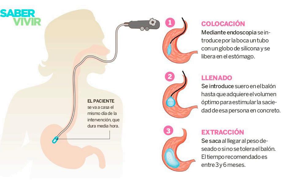 Este tipo de procedimiento se realiza por endoscopía, introduciendo el balón de silicona por la boca hasta llegar al estómago y luego, se llena con una solución salina. El efecto que produce es mandar un mensaje al cerebro de saciedad.
