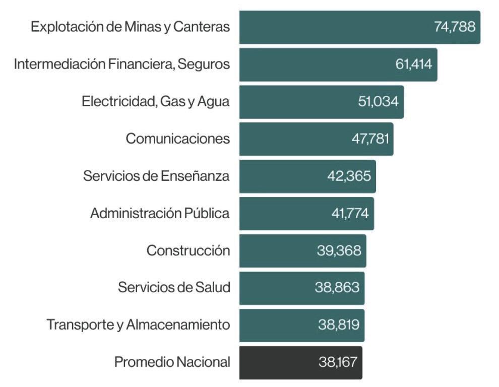 En esa misma línea, continúa la intermediación financiera y los seguros, que registra un salario promedio de RD$61,414, ocupando el segundo puesto. Además, en el tercer y cuarto lugar aparecen los sectores de electricidad, gas y agua, con RD$51,034, y comunicaciones, con RD$47,781. A estos se suma servicios de enseñanza, que ocupa el quinto puesto, con un salario promedio de RD$42,365.