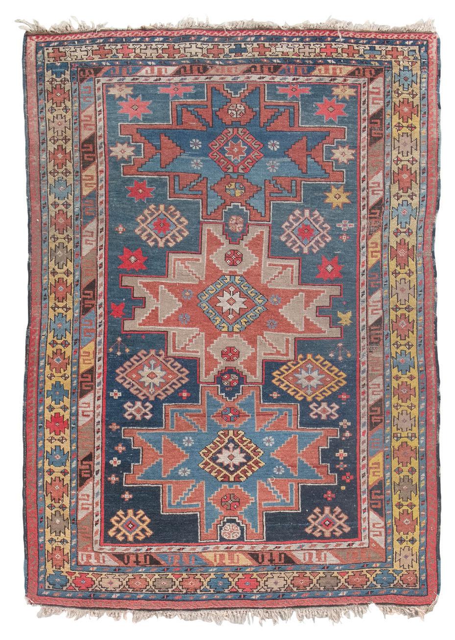 Abrashed blue field contains three blue, faded red and khaki Lesghi stars surrounded by small colorful geometric medallions with latch hook perimeters. Several colorful borders contain a variety of motifs. 400/600
