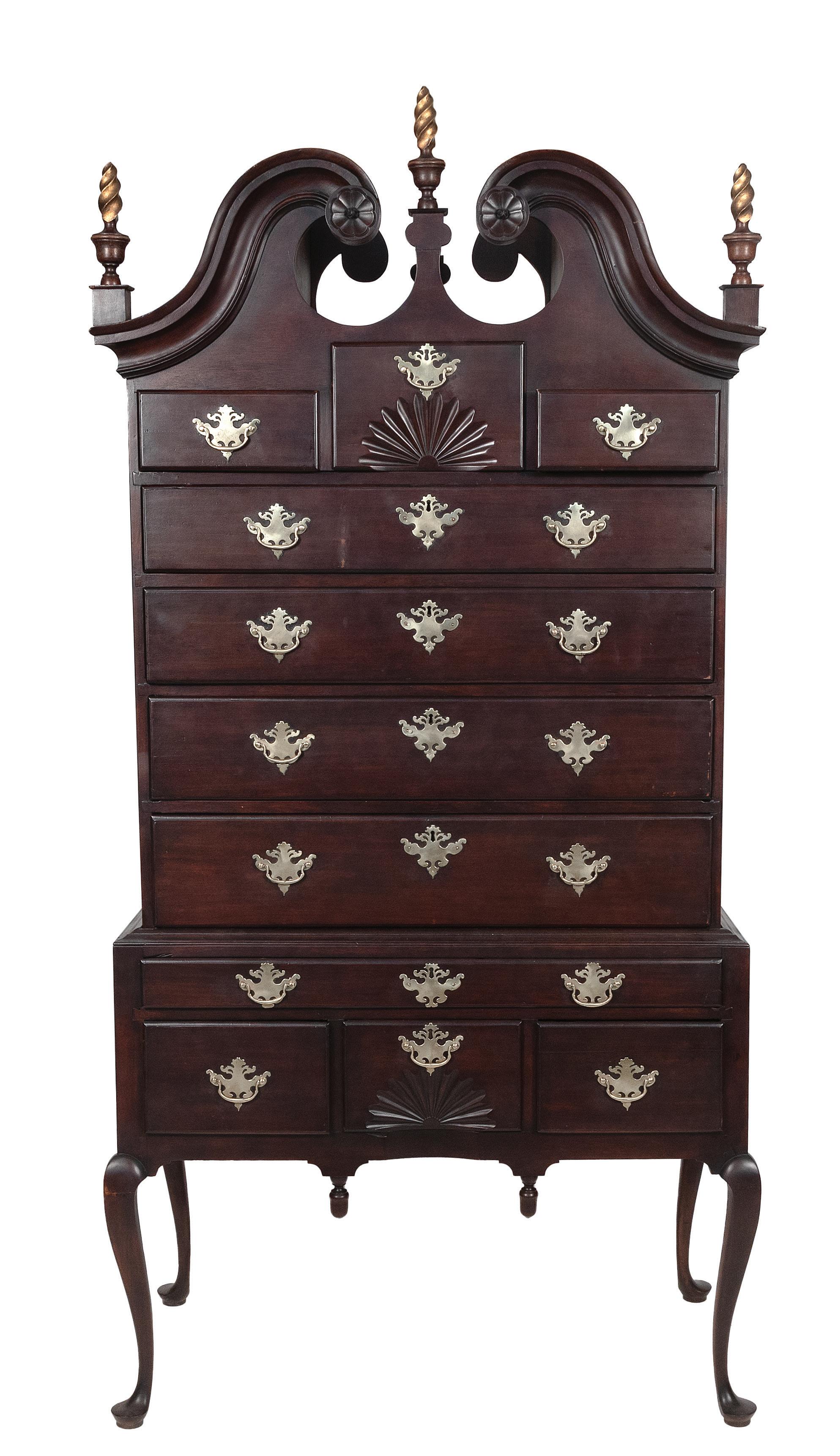 QUEEN ANNE BONNET-TOP HIGHBOY Massachusetts, Mid-18th Century In mahogany. Nicely arched bonnet with an unusual back panel and flower blossom carvings at the ends of the scrolls. Three flame and urn finials with gilt twisted flames. Upper case with three side-by-side drawers, the central with shell carving, over four graduated full-width drawers. Lower case with a full-width drawer over three side-by-side drawers, the central with repetitive shell carving. Skirt with two acorn drops. Cabriole legs end in pad feet. Old label and chalk writing on upper case backboard. Height 84”. Width 40.5”. Depth 21.75”. 8,000/12,000