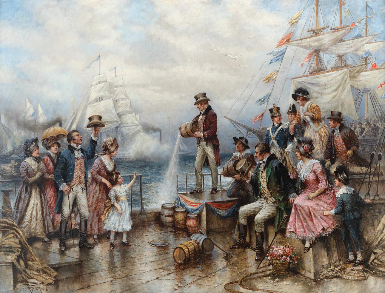 “The Opening of the Erie Canal”. Depicts New York Governor DeWitt Clinton christening the canal by pouring water from Lake Erie into the Atlantic Ocean. Signed lower left “E. Percy Moran”. Titled on frame plaque. Oil on canvas, 30” x 40”. Framed 38” x 48”. 3,000/5,000