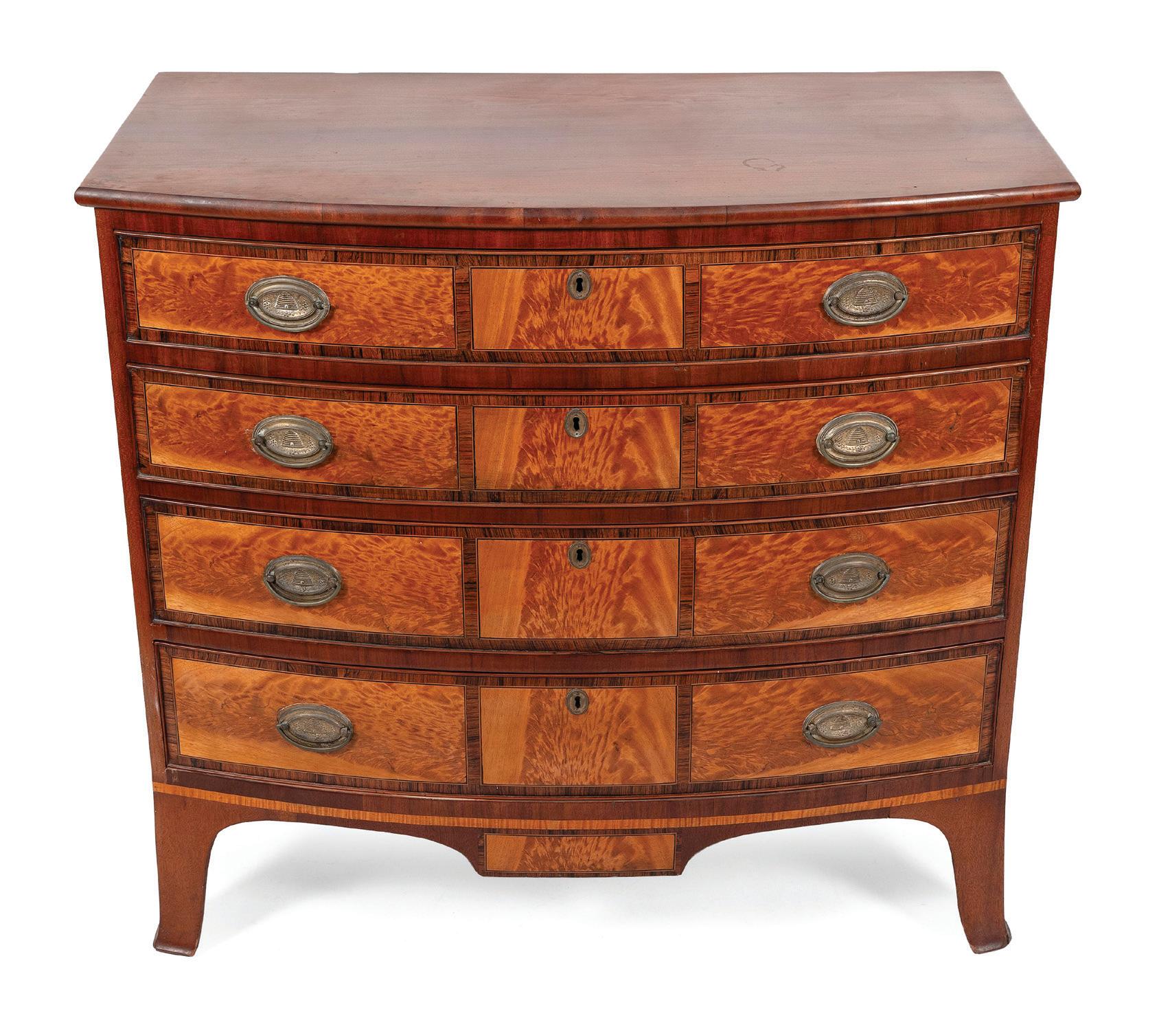 HEPPLEWHITE BOWFRONT BUREAU ATTRIBUTED TO JUDKINS AND SENTER Portsmouth, New Hampshire, Circa 1810 In cherry. Four graduated full-width drawers, each with cock-bead molding along edges and three flame birch panels framed with string inlay. Brass beehive pulls, possibly original. Shaped skirt with matching flame birch panel drop at center. High splayed French bracket feet. Height 38”. Width 41”. Depth 21.75”.