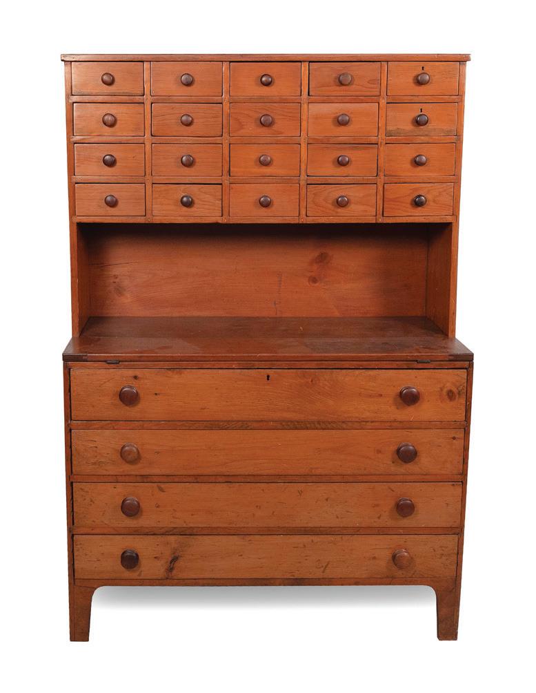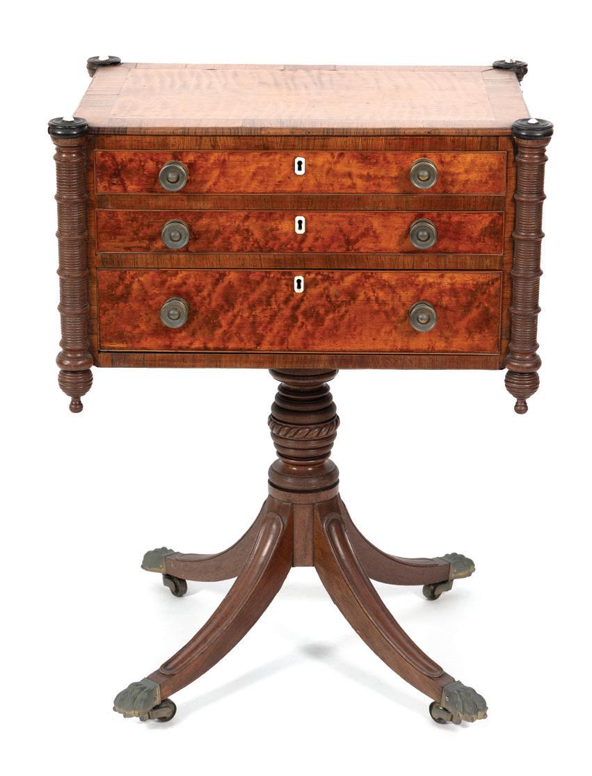 Exceptionally figured mahogany, bird’s-eye maple and tiger maple veneer. Top with a tiger maple panel bordered with rosewood. Compartmented top drawer fitted with writing slant. Graduated drawers below. Period, possibly original, ivory escutcheons and brass pulls. Ring-turned turrets at corners of case with ivory caps. Mahogany base with a spiral-carved knop, four reverse-arched legs with carved moldings, and brass-capped paw feet fitted with casters. Height 29”. Width 21.75”. Depth 16”. 3,000/5,000