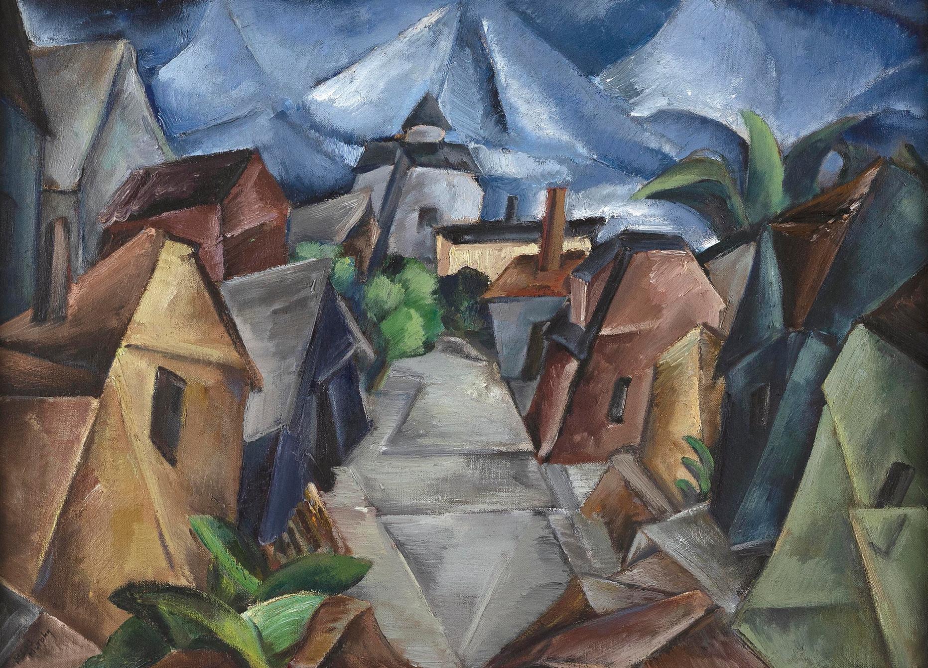 Street Scene, Provincetown. Signed lower right “B. Lazzell”. Inscribed verso in the artist’s hand “painted in Provincetown, Mass. [...] Aug. 1915, by Blanche Lazzell”. Housed in a Heydenryk frame. Oil on canvas, 17” x 15”. Framed 24” x 23”.