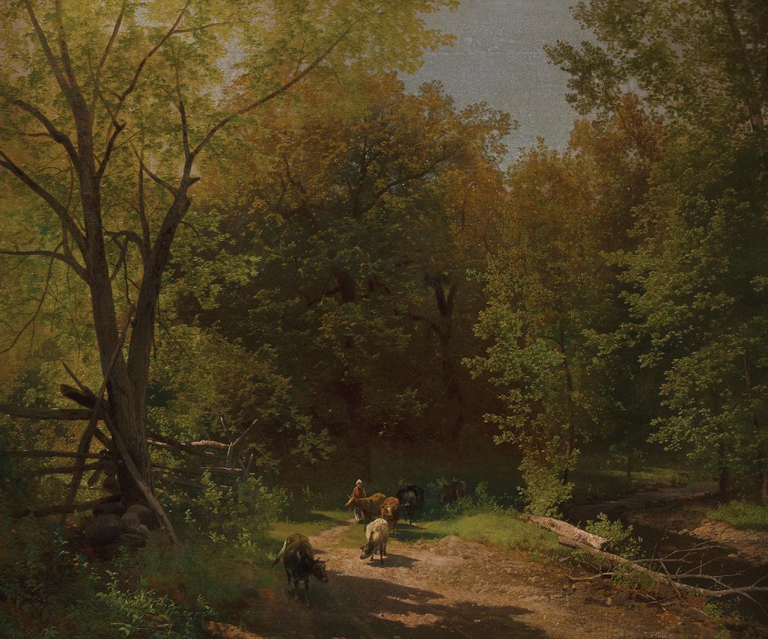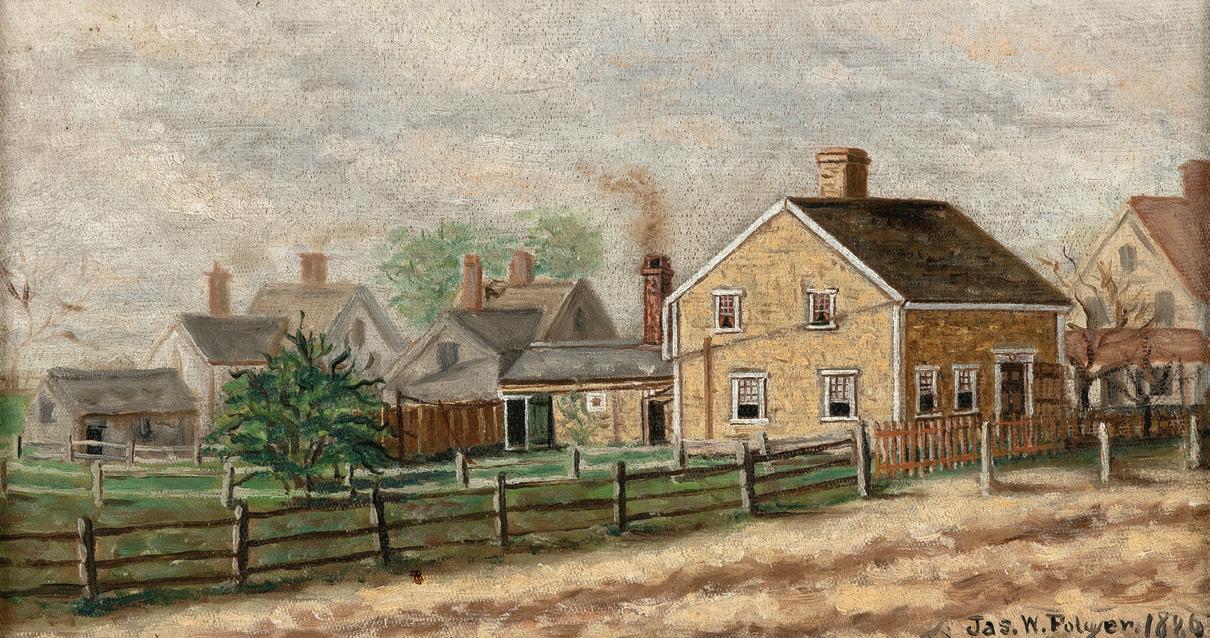 View of a farm with a stagecoach in the foreground. Signed and dated lower right “E.S.B. 1875”. Frame with maker’s label for Hall and Garrison, Philadelphia. Oil on canvas, 16” x 24”. Framed 25” x 33”. 2,000/3,000
