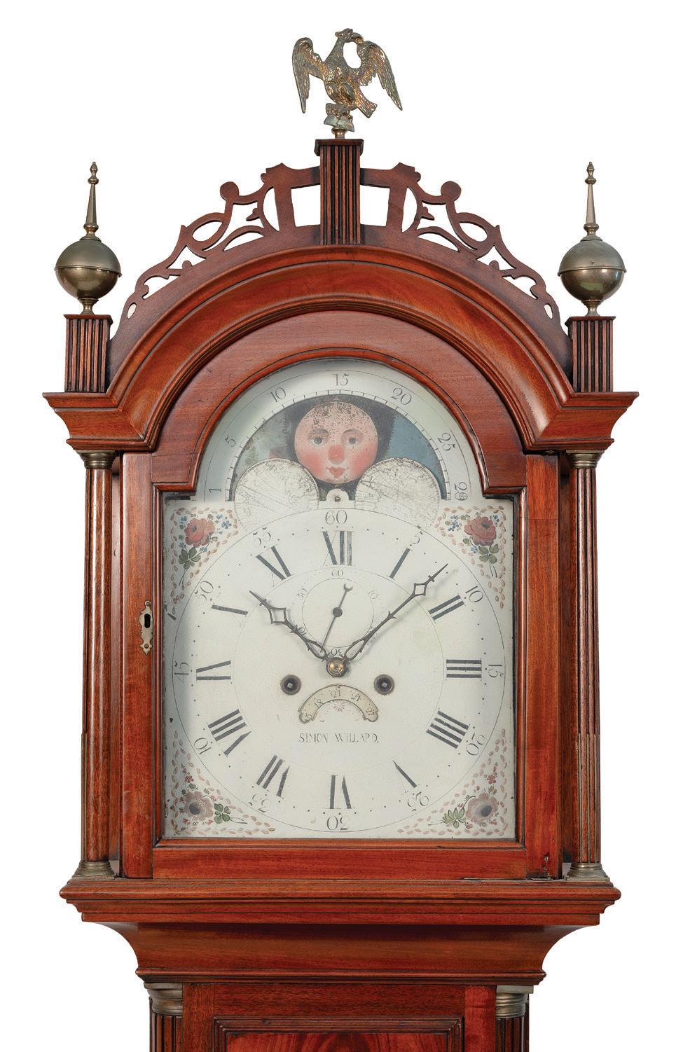 Mahogany case. Pierced fretwork joins three fluted plinths, the central plinth supporting an eagle finial and the side plinths with ball-and-steeple finials. Arched dial door and arched glazed side windows. Bonnet fronted by full fluted columns with brass stop fluting. Molded pendulum door flanked by brass-capped fluted quarter columns. Molded base on ogee bracket feet. Painted metal face with floral decoration at corners, a Roman numeral hour dial, an Arabic numeral minutes register, a second sweep and a calendar dial. Moon phase disk in lunette. Signed on dial “Simon Willard”. Height 88”. 25,000/35,000