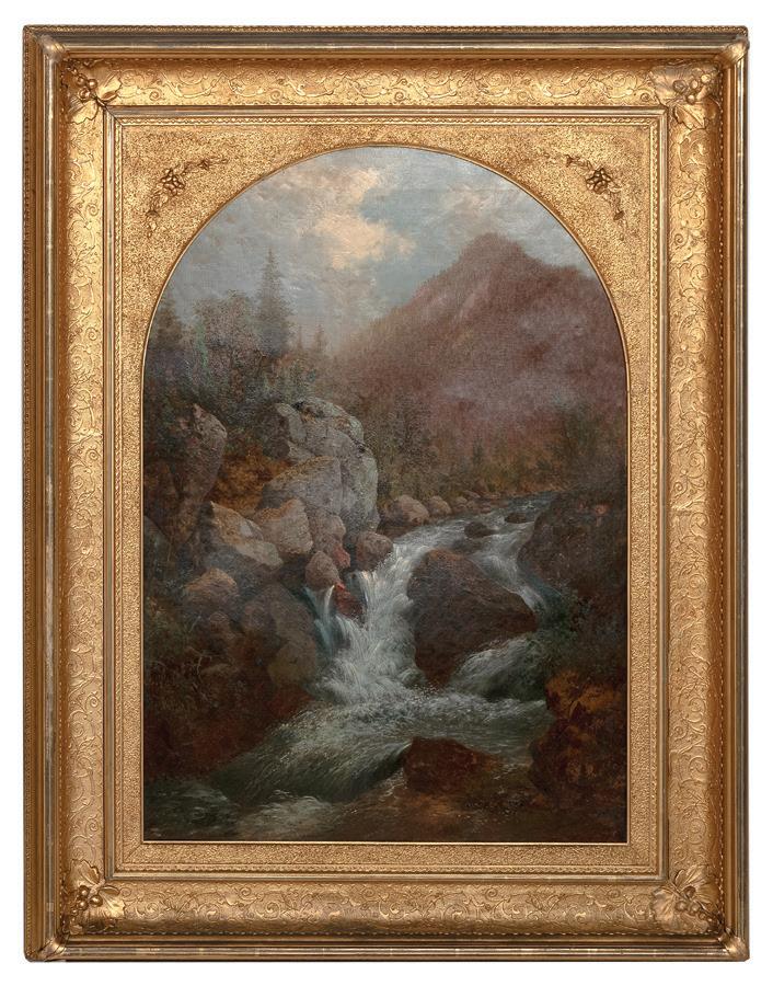 “Mount Washington & Saco River at Hiram, Maine”. Signed and dated lower left “F.H. Shapleigh 1888”. Titled in the artist’s hand verso. Housed in a period hand-carved frame. Label verso for art supplier Frost and Reed, Boston. Oil on canvas, 18” x 30”. Framed 26” x 38”. 5,000/8,000